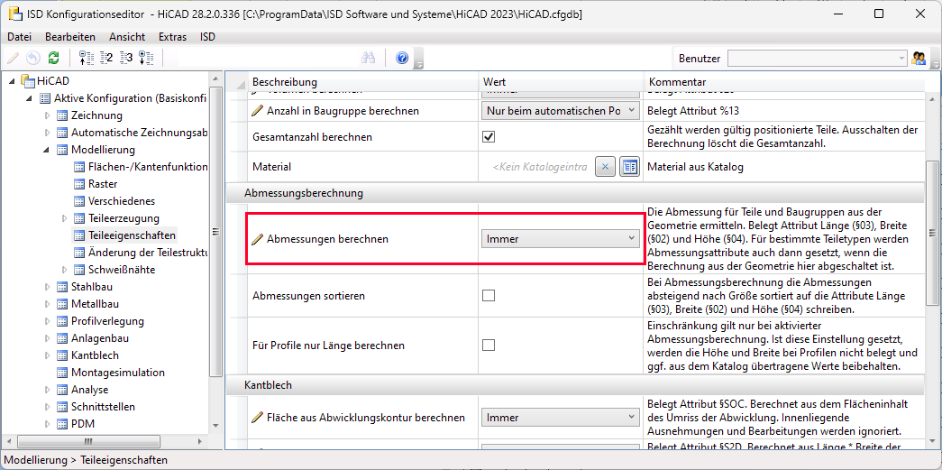 Die Attribute Länge, Breite und Höhe werden sofort aktualisiert, d. h. nach jeder Änderung eines Teils oder nach dem Hinzufügen weiterer Teile angepasst. Dies ist die ISD-seitige Voreinstellung.