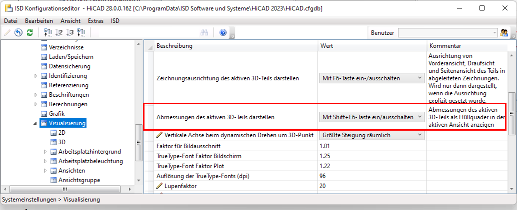 Sollen die Abmessungen in der Konstruktion als Hüllquader angezeigt werden, dann lässt sich dies unter Systemeinstellungen > Visualisierung mit dem Parameter Abmessungen des aktiven 3D-Teils darstellen festlegen.