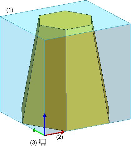 Darüber hinaus lässt sich dort festlegen, ob die Abmessungen auch in der Konstruktion dargestellt werden sollen. Die Darstellung erfolgt in Form eines transparenten Hüllquaders (1). Dies ist der kleinste Quader, der das aktive Teil bzw. alle Teile der aktiven Baugruppe vollständig umschließt. Zusätzlich wird am Hüllquader das Koordinatensystem (2) angezeigt. Die farbigen Pfeile des Koordinatensystems geben die Richtung der Abmessungen an: