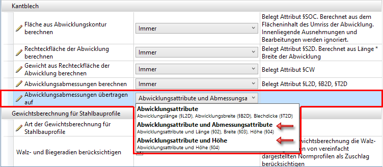 Ist die Abmessungsberechnung eingeschaltet und im Konfigurationsmanagement unter Modellierung > Teileeigenschaften für den Parameter Abwicklungsabmessungen übertragen auf die Einstellung Abwicklungsattribute und Abmessungen oder Abwicklungsattribute und Höhe gewählt, dann ist die Abmessungsberechnung für Kantbleche automatisch inaktiv!