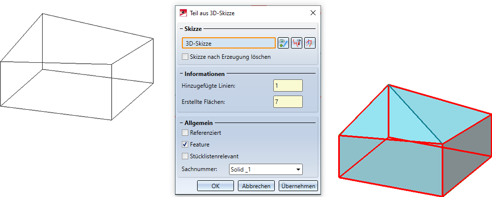Beim Klick auf Übernehmen bleibt nach der Erzeugung des Teils das Dialogfenster geöffnet, so dass Sie ohne erneuten Funktionsaufruf weitere Teile aus 3D-Skizzen ableiten können. Mit OK wird das Dialogfenster geschlossen.