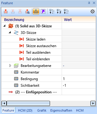 War bei der Erzeugung des Teils die Checkbox Feature aktiv, dann wird ein entsprechendes Feature mit dem Namen Solid aus 3D-Skizze erzeugt. Mit einem Doppelklick auf diesen Eintrag lässt sich der Funktionsdialog Teil aus 3D-Skizze starten, beispielsweise um die einem Teil zugrunde liegende 3D-Skizze zu bearbeiten.