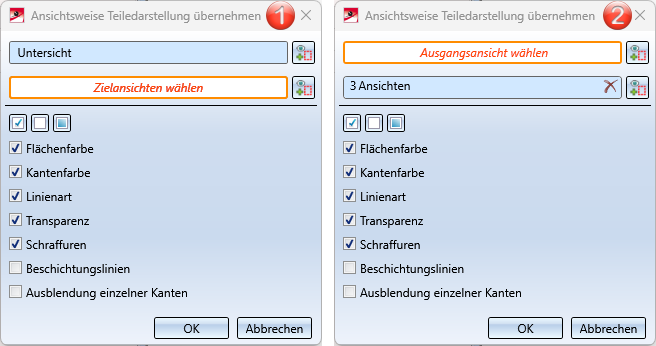 Der Dialog hängt davon ab, ob beim Aufruf der Funktion eine einzelne Ansicht aktiv ist (1) oder im ICN mehrere Ansichten ausgewählt sind (2).