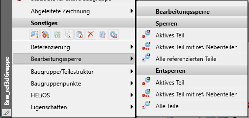 Durch diese Erweiterung stehen die Funktionen für die Bearbeitungssperre jetzt in einem eigenen Menü zur Verfügung und nicht wie bisher im Menü Referenzierungsfunktionen. Sie erreichen die Funktion über das Kontextmenü für Teile und dort über den Eintrag Bearbeitungssperre.