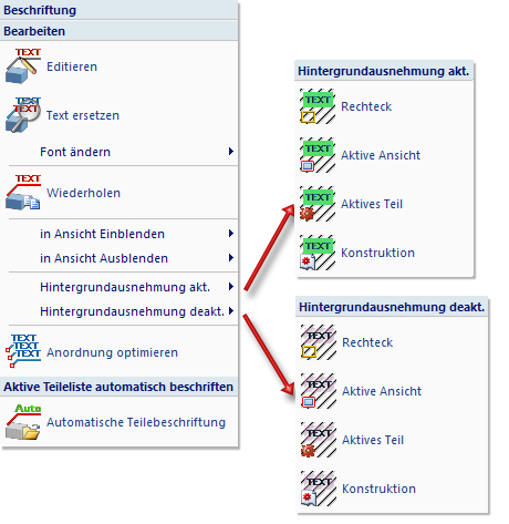 - Hintergrundausnehmungen lassen sich auch in einem Schritt für mehrere Beschriftungen setzen oder aufheben. Dazu stehen unter 3D-Bemaßung + Text > Text > Teilebeschriftung mit freiem Text + Hinweislinie > Hintergrundausnehmung akt. bzw. 3D-Bemaßung + Text > Text > Teilebeschriftung mit freiem Text + Hinweislinie > Hintergrundausnehmung deakt. entsprechende Funktionen zur Verfügung.