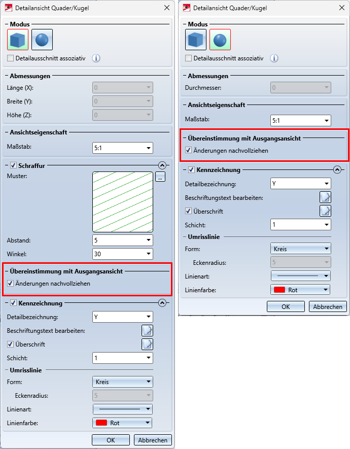 Ab HiCAD 2023 lässt sich beim Erzeugen von Detailansichten festlegen, ob die Detailansicht zur Ausgangsansicht assoziativ sein soll oder nicht. Dazu sind die Dialogfenster Neue Detailansicht und Detailansicht bearbeiten entsprechend erweitert worden.