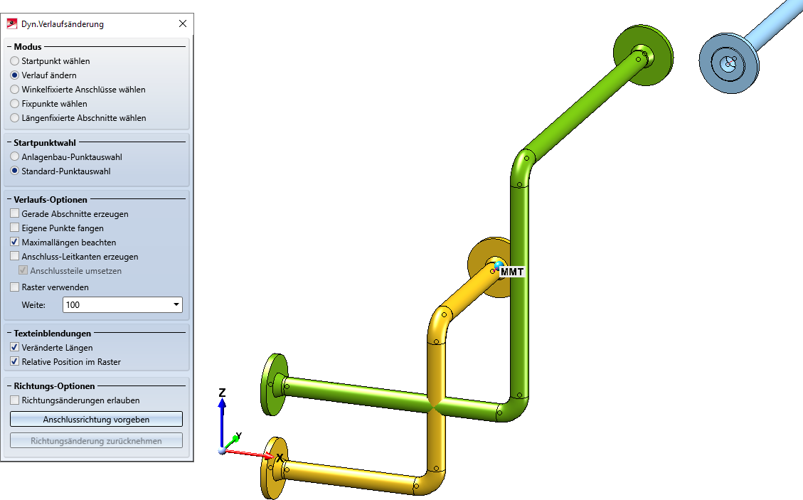 Ist diese Option aktiv, dann können sie einen beliebigen Punkt als Startpunkt auswählen. Um die zu verändernden Abschnitte eindeutig festzulegen, muss sich die Verlaufsänderung aber dennoch auf einen Anlagenbau-Anschlusspunkt beziehen. Daher schlägt HiCAD Ihnen zunächst automatisch einen Anlagenbau-Anschlusspunkt in der Nähe des gewählten Punktes vor und markiert diesen mit dem Schriftzug MMT.