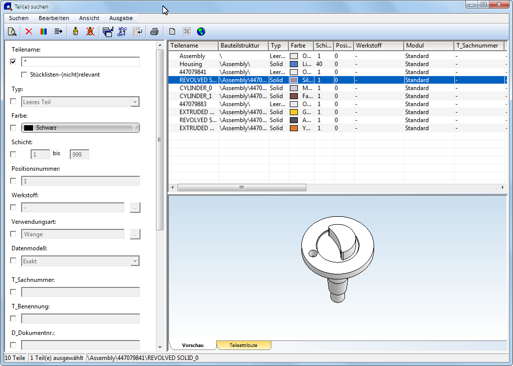 Die Suchfunktion ermöglicht das gezielte Suchen nach Teilen mit bestimmten Eigenschaften.