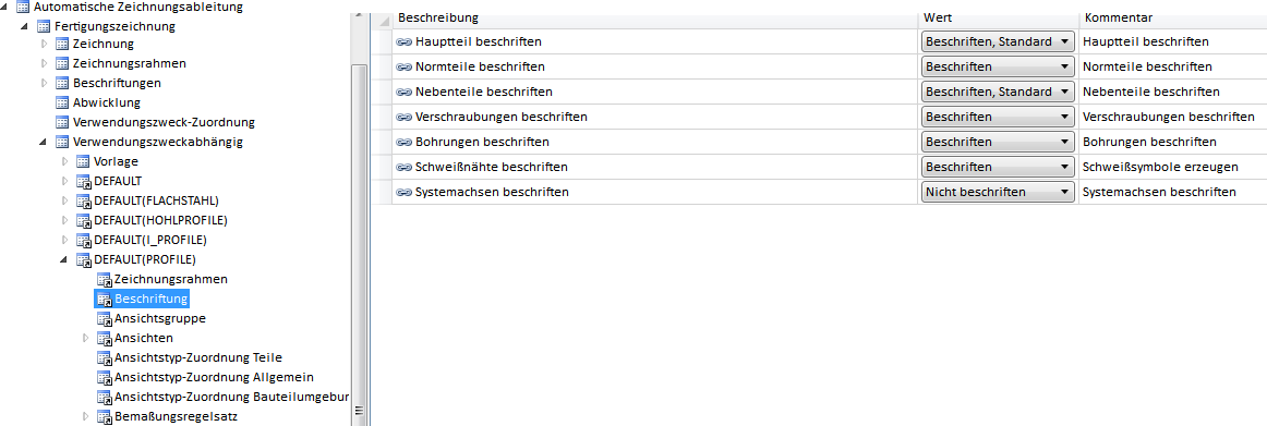 Werden die Einstellungen für die Zeichnungsableitung aus einer Konfiguration geladen, dann werden die im Konfigurationsmanagement für den entsprechenden Verwendungszweck unter Automatische Zeichnungsableitung > Fertigungszeichnung > Verwendungszweckabhängig > name > Beschriftung festgelegten Einstellungen ausgewertet. name ist dabei der Name des jeweiligen Verwendungszwecks.