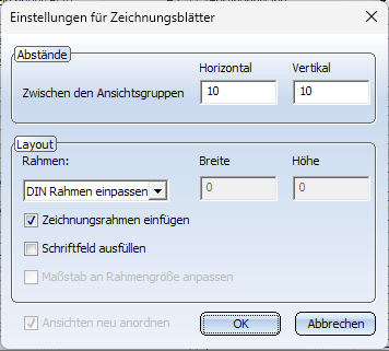 Hier wird automatisch ein DIN-Rahmen gewählt, der die erzeugten Ansichtsgruppen vollständig und unskaliert enthält. Die Option Maßstab an Rahmengröße anpassen ist dann nicht verfügbar.