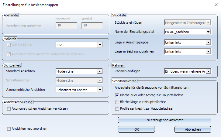 Die Voreinstellungen der Dialogfenster werden im Konfigurationsmanagement unter Automatische Zeichnungsableitung > Fertigungszeichnung festgelegt.