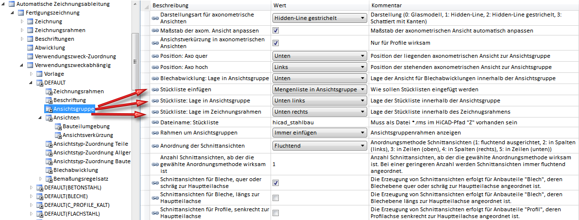 Art und Lage der Stückliste lassen sich im Konfigurationsmanagement für jeden Verwendungszweck separat voreinstellen und zwar unter Automatische Zeichnungsableitung > Fertigungszeichnung > Verwendungszweckabhängig > .... > Ansichtsgruppe. Werden die Zeichnungsparameter aus einer im Konfigurationsmanagement gespeicherten Konfiguration geladen, dann sind die entsprechenden Einstellungen aus dem Konfigurationsmanagement im Dialogfenster voreingestellt.