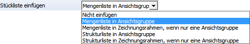 Es wird eine Mengen- bzw Strukturstückliste eingefügt, die immer innerhalb der Ansichtsgruppe liegt. Die Lage der Stückliste wird über die Listbox Lage in Ansichtsgruppe bestimmt.