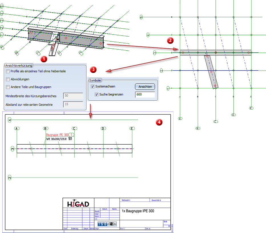 (1) Ausgangskonstruktion mit Raster (Abstand 500) und Raster-Untersystem, (2) Draufsicht, (3) Einstellungen für Ansichten, (4) Einzelteilzeichnung des Profils