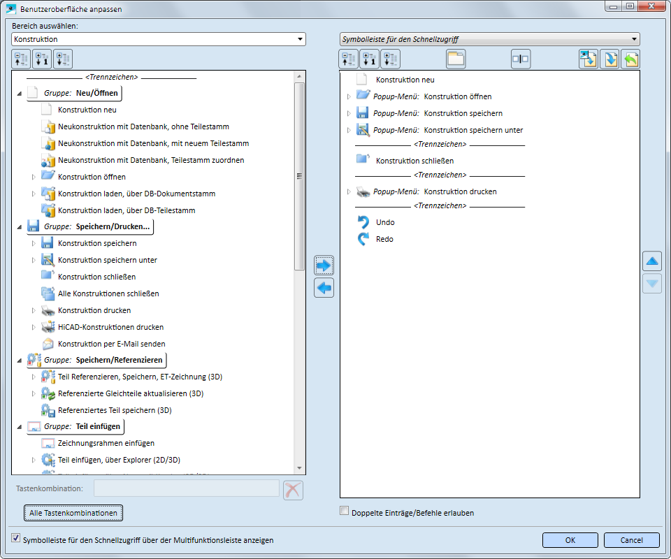 Hinzufügen >> Überträgt die markierte Funktion des HiCAD Menübandes in die Schnellzugriffsleiste Beachten Sie: Ist der links gewählte Eintrag in der Schnellzugriffsleiste bereits vorhanden und gleichzeitig die Checkbox Doppelte Einträge/Befehle erlauben inaktiv, dann ist die Funktion Hinzufügen >> gesperrt! |