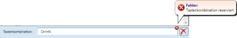 Um die Zuordnung zu ändern oder eine neue Zuordnung zu definieren, klicken Sie in das Feld Tastenkombination und geben dann auf der Tastatur die gewünschte Tastenkombination ein. Ist die angegebene Tastenkombination bereits vergeben, dann wird dies durch das Symbol angezeigt. Wenn Sie den Cursor über dieses Symbol bewegen, wird angezeigt, wo diese Kombination bereits verwendet wird oder dass es sich um eine reservierte Tastenkombination (Makro-Konflikt) handelt.