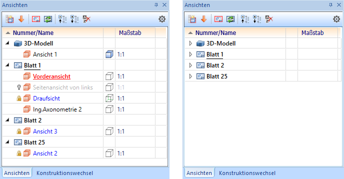 Für jede Ansicht wird ein Symbol für den jeweiligen Ansichtstyp angezeigt sowie der Ansichtsname. Ist in den Einstellungen die mehrspaltige Struktur aktiv, dann werden außerdem ein Symbol für den Darstellungsmodus sowie der Maßstab der Ansicht angezeigt. Die aktive Ansicht wird immer in roter Schrift und unterstrichen dargestellt,