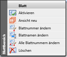 Zur Bearbeitung von Modell-/ Blattbereichen oder Ansichten können Sie auch Funktionen der entsprechenden Kontextmenüs nutzen. Dazu klicken Sie mit der rechten Maustaste auf den entsprechenden ICN-Eintrag.