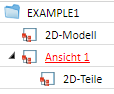 Beim Anlegen einer neuen Konstruktion wird in die 2D-Struktur immer ein Hauptteil mit dem Namen Ansicht 1 eingefügt. Diesem Hauptteil ist ein Nebenteil mit dem Namen 2D-TEILE zugeordnet. Jedes Mal, wenn Sie eine neue 3D-Ansicht wählen, wird in der 2D-Struktur der Name des Hauptteils an die gewählte Ansicht angepasst, beispielsweise ING.AXONOMETRIE 2 oder DRAUFSICHT. Dieses Teil hat rein organisatorischen Charakter und kann nicht gelöscht werden! Wenn Sie 2D-Geometrieelemente in eine 3D-Ansicht einfügen ohne zuvor ein neues 2D-Hauptteil zu definieren, dann werden diese automatisch dem Nebenteil 2D-TEILE zugeordnet.
