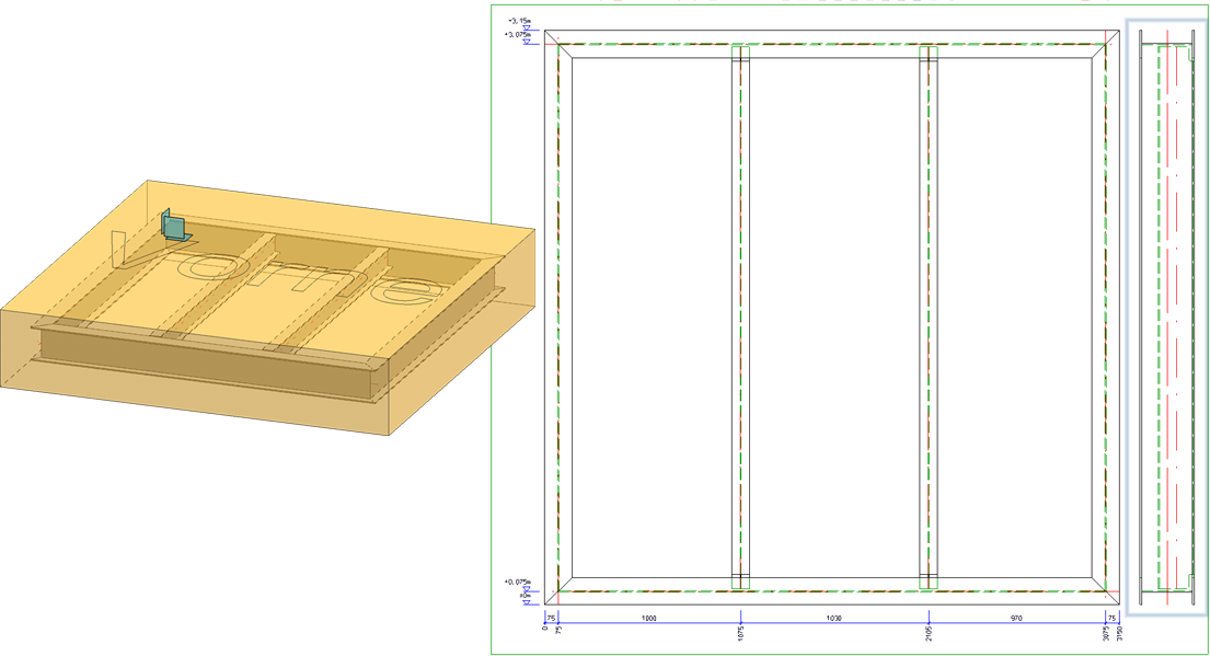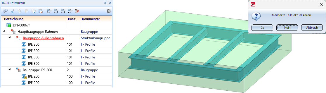 Obwohl die Baugruppe IPE200 im Hüllquader der Ansichtsgruppe liegt, wird sie jetzt bei der Montagezeichnung nicht berücksichtigt, da sie nicht zur Baugruppe Außenrahmen gehört.
