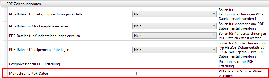 Die Erstellung von PDF-Dateien kannt alternativ auch in Schwarzweiß erfolgen. Dazu sind die Einstellungen im Konfigurationsmanagement unter PDM > Zeichnungsverwaltung > Externe Fertigungsunterlagen entsprechend erweitert worden.