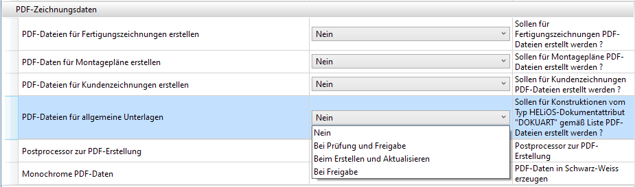 Analog zu Fertigungszeichnungen, Montageplänen und Kundenzeichnungen kann jetzt auch für allgemeine Unterlagen im DXF-, DWG- und PDF-Format gewählt werden, wann diese erstellt werden sollen. Dazu sind die Einstellungen im Konfigurationsmanagement unter PDM > Zeichnungsverwaltung > Externe Fertigungsunterlagen entsprechend erweitert worden.