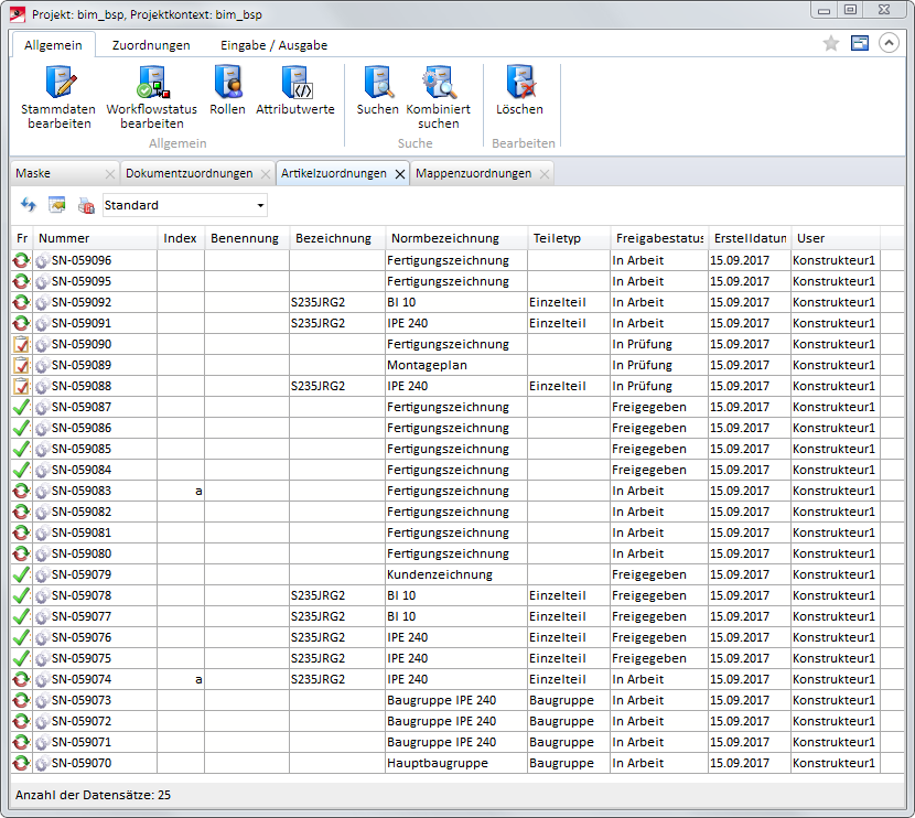 Darüber hinaus geben die Registerkarten Dokument- und Artikelzuordnungen Auskunft über die mit dem aktiven Projekt verknüpften Dokumente ( z. B. Konstruktion und Fertigungszeichnungen) und Artikel (Baugruppen, Profile, Bleche etc.).