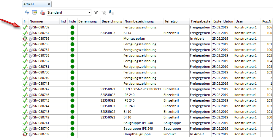 1. Alle gewählten Zeichnungen erhalten jetzt den Status Freigegeben. Das sehen Sie beispielsweise mit der Funktion Zeichnungsverwaltung > HELiOS PDM > Verknüpfte Dokumente oder im HELiOS Desktop.