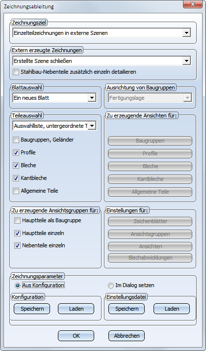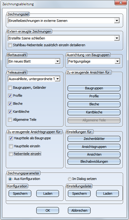 Sollen Baugruppen- und Werkstattzeichnungen erstellt werden, dann müssen Sie die Einstellungen manuell festlegen, d. h. die Zeichnungen mit der Funktion erstellen. Bei Werkstattzeichnungen lässt sich dabei noch festlegen, ob nur eine einzige Werkstattzeichnung mit allen Bauteilen erstellt wird oder mehrere Werkstattzeichnungen, die nur Profile bzw. nur Bleche und andere Teile enthalten.