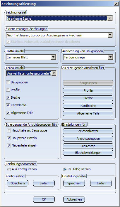 Einstellungen für Werkstattzeichnungen mit Blechen u. a. Teile |