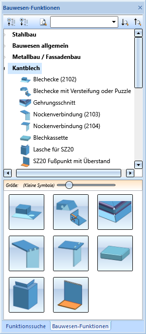 Der Einbau von Designvarianten im Blech erfolgt über das Andockfenster Bauwesen-Funktionen.