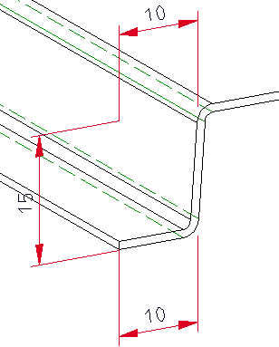 Mit der Z-Kantung können Sie zwei Laschen in einem Arbeitsschritt an ein Blech ankanten. Sobald Ihre Eingaben ausreichen, wird Ihnen eine Vorschau der neuen Laschen angezeigt. D. h. wählen Sie eine Anschlusskante, so wird die mögliche Z-Kantung mit den Standardwerten angezeigt. Haben Sie Breite über Punkt aktiviert, so werden Ihnen die neuen Laschen erst nach dem Identifizieren eines Punktes und der Breite oder zweier Punkte angezeigt, sofern Sie die Anschlusskante gewählt haben. Ferner sehen Sie direkt die Veränderung, wenn Sie z. B. von Kürzen, außen auf Kürzen, innen umschalten. Ist die Option Sofort übernehmen aktiv, so wird die Z-Kantung bei einer sinnvollen Eingabe sofort angekantet und kann dann über das Featureprotokoll geändert werden.