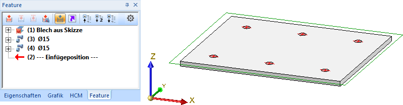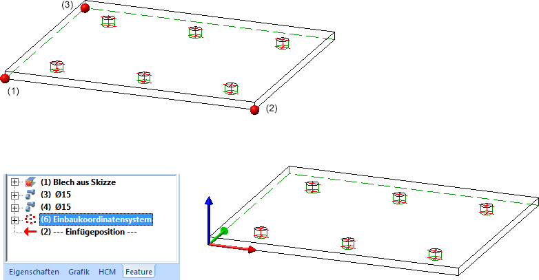 Das Einbau-Koordinatensystem wird in das Feature-Protokoll eingetragen.