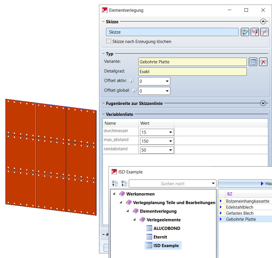 - Die Variante Gebohrte Platte steht jetzt in der Tabelle ISD Example zur Verfügung und kann für die Elementverlegung genutzt werden, z. B. auf der abgebildeten Skizze.