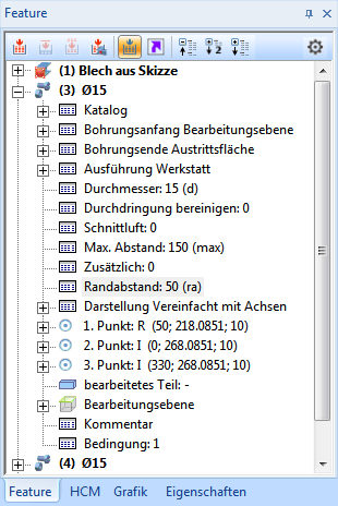 - Doppelklick auf den Feature-Eintrag Durchmesser: 15-> Eingabe der Variable d und Wert 15