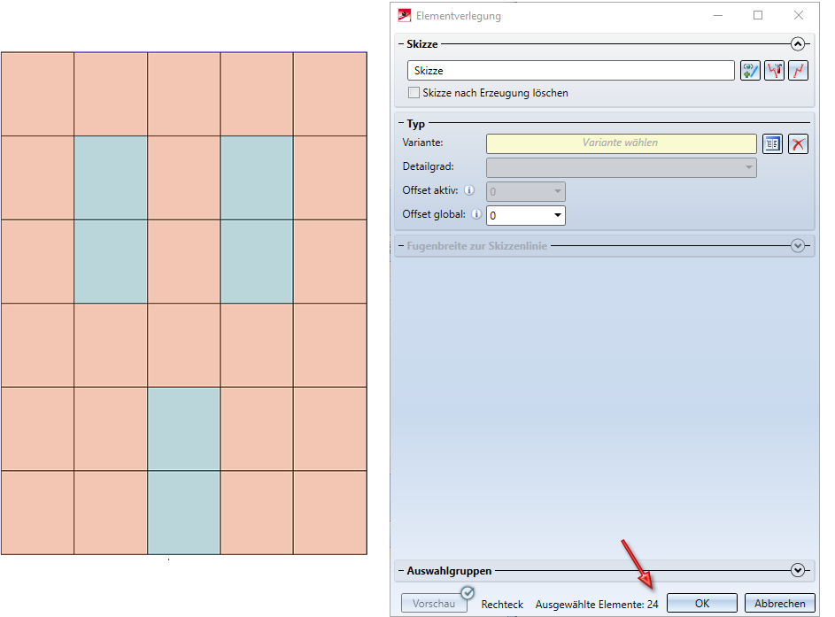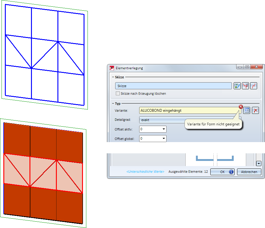 - Haben Sie einen Skizzenbereich ausgewählt, zu dem die gewählte Variante nicht passt - beispielsweise einen polygonförmigen Skizzenbereich und eine rechteckiges Verlegeelement wie ALUCOBOND eingehängt - dann wird dies im Dialogfenster durch das Symbol