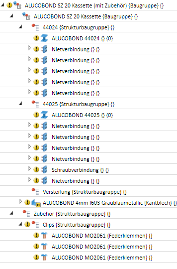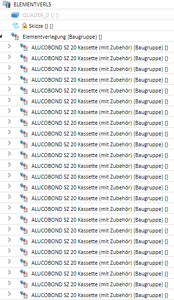 - Die Struktur der Baugruppe Elementverlegung hängt von der gewählten Variante ab. Beispielsweise besteht die Baugruppe Elementverlegung beim Einbau von ALUCOBOND SZ20 Kassetten aus Baugruppen mit dem Namen ALUCOBOND SZ 20 Kassette (mit Zubehör), die wiederum unterteilt sind in die Baugruppe ALUCOBOND SZ 20 Kassette und die Strukturbaugruppe Zubehör.
