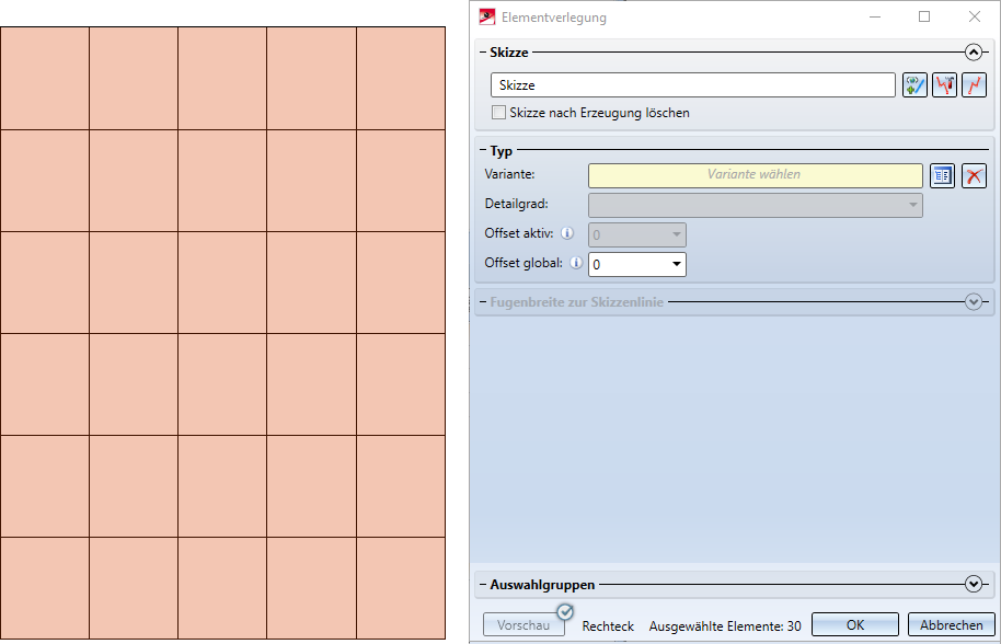 Voraussetzung für die Elementverlegung ist eine ebene Skizze, die quasi das Raster der Verlegung darstellt. Dabei sind folgenden Verlegearten möglich.