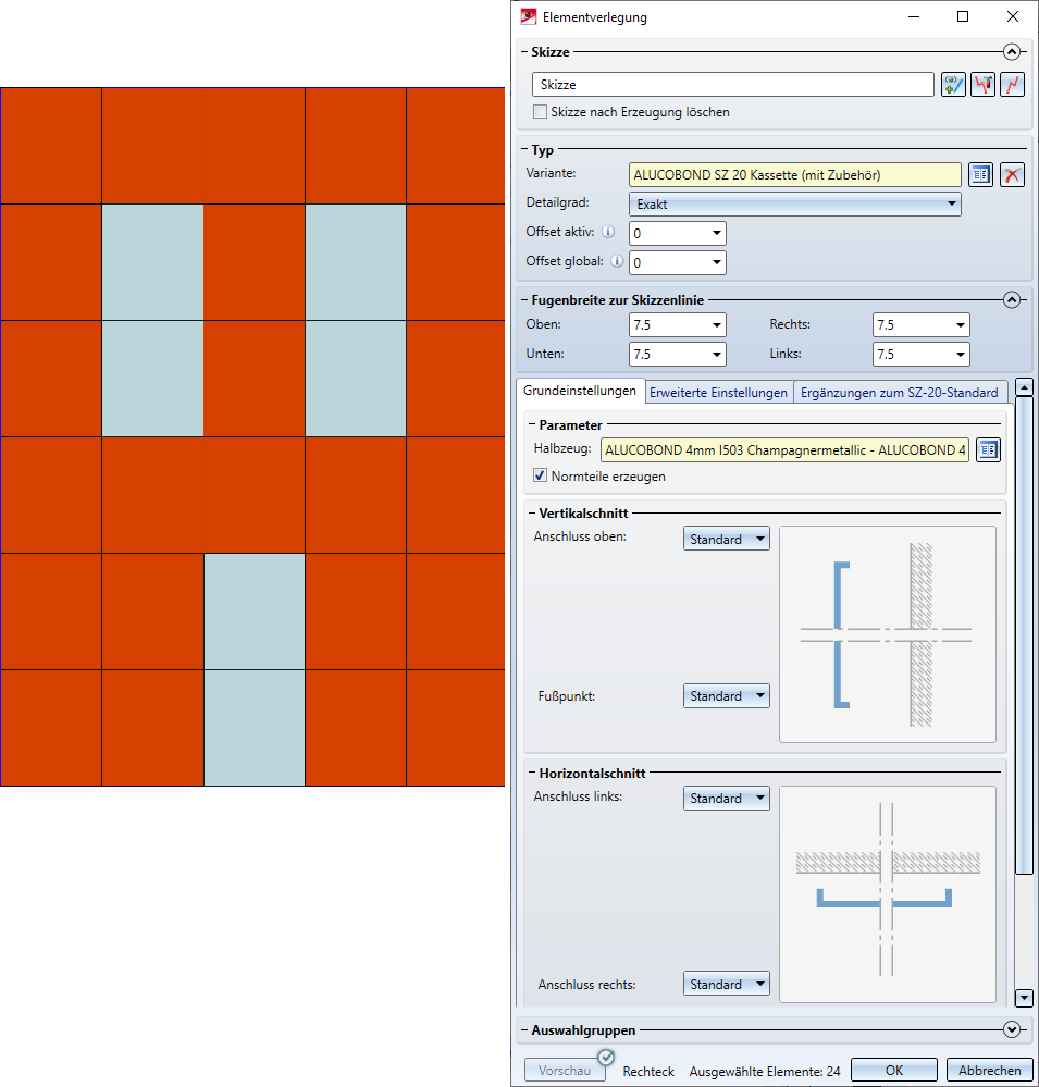 - Verlegen von "rechteckigen" Verlegeelementen (z. B. ALUCOBOND geklebt, genietet oder eingehängt) auf rechteckigen Skizzenbereichen,