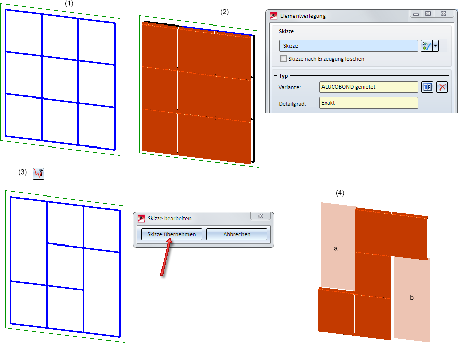 Beispiel: In der Abbildung ist die Skizze (1) ausgewählt worden. Für alle Skizzenbereiche (2) wurde als Variante ALUCOBOND genietet gewählt, aber die Berechnung noch nicht gestartet. Wird jetzt die Skizze wie abgebildet bearbeitet (3) und dann übernommen (4), dann muss für die Skizzenbereiche a und b die Variante erneut zugeordnet werden.