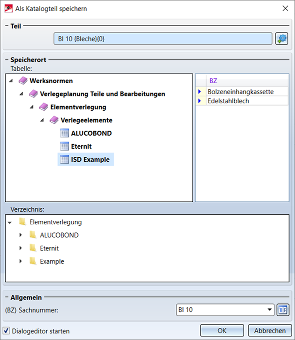 Unter Allgemein lässt sich die Bezeichnung (BZ) der Variante im Katalog ändern. Defaultmäßig wird hier die Sachnummer des gewählten Teils / der Baugruppe angezeigt. Durch einen Klick auf das Symbol