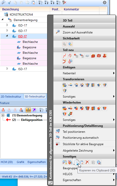 Es muss in eine neue Konstruktion kopiert werden. Durch einen Rechtsklick auf das Teil im ICN gefolgt von einem Klick auf Sonstiges > Kopieren ins Clipboard kopieren wir das Teil ins HiCAD-Clipboard.