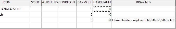 Zum Schluss müssen wir HiCAD noch mitteilen, dass diese Vorlagen für diese Variante genutzt werden sollen. Dafür starten wir den Katalogeditor und navigieren zum Katalogeintrag unserer Variante. Unsere Beispielvariante ISD-17 finden wir dabei unter Werksnormen > Verlegplanung Teile und Bearbeitungen > Elementverlegung > Verlegeelemente > ISD Example. In der Tabelle finden wir die Spalte DRAWINGS. Hier tragen wir den Pfad zur in Schritt 2 erzeugten Textdatei ein - wieder relativ zum Ordner Werksnormen: