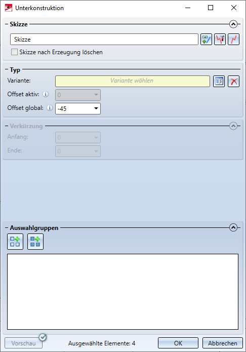 Auch bei der Unterkonstruktion können Sie mit Auswahlgruppen arbeiten. Diese können Sie im Bereich Auswahlgruppen des Dialogfensters bearbeiten und anwenden.