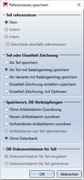 - Der Quader ist nun für die Speicherung im Katalog für die Elementverlegung bereit. Wählen Sie die Baugruppe Eternit-Platte aus und aktivieren die Funktion Konstruktion > Speichern/Referenzieren > Teil referenzieren / Speichern / ET-Zeichnung. Im erscheinenden Dialog wählen Sie Ohne Referenzieren, Als Teil mit Katalogeintrag speichern sowie Ohne Datenbank aus.