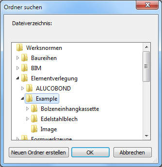 - Als Datenverzeichnis wählen Sie Werksnormen\Elementverlegung\Example aus, als Katalog Verlegeplanung Teile und Bearbeitungen\Elementverlegung\Verlegeelemente\ISD Example. Die dann erscheinenden Einstellungen können unverändert übernommen werden; ein Bitmap muss hier nicht erzeugt werden.