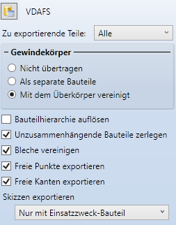Rechts im Dialogfenster können Sie Optionen für den Export festlegen. Diese Einstellungen lassen sich im ISD Konfigurationsmanagement unter Schnittstellen > Allgemeine 3D-Schnittstellen vorbelegen. Diese Einstellungen können Sie durch einen Klick auf das Symbol