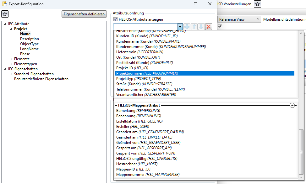 Dabei ist es vom Zielattribut mit abhängig, welche HELiOS-Attribute Ihnen angeboten werden: Für ein Mapping mit dem IFC-Attribut Elemente > Name stehen z. B. die Attribute der Typen HELiOS-Artikelattribut und HELiOS-Dokumentattribut zur Verfügung, ist das ausgewählte IFC-Zielattribut etwa Projekt > Name,. dann werden Ihnen Projekt- und Mappen-Attribute zur möglichen Zuordnung angezeigt