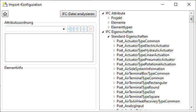 Über den Button IFC-Datei analysieren können Sie außerdem eine vorhandene IFC-Datei auswählen, die daraufhin analysiert wird. Dabei werden ihre individuellen PropertySet-Definitionen zusätzlich in den Baum der IFC-Attribute geladen, die links mit entsprechenden HiCAD-Attributen gemappt werden können.