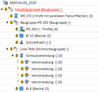Beim Einbau von Stahlbauanschlüssen zwischen zwei Profilen wird für jedes der Profile eine stücklistenrelevante Baugruppe angelegt - strukturiert nach DSTV–Richtlinien. Das heißt, die Baugruppe enthält das jeweilige Profil als Baugruppenhauptteil und - auf derselben Stufe - die zum jeweiligen Profil gehörenden Komponenten des Anschlusses. Je nach Konstruktionssituation kann es In seltenen Fällen vorkommen, dass diese Strukturierung nach DSTV nicht durchgeführt wird. Dies kann durch Einsatz von Strukturbaugruppen vermieden werden.